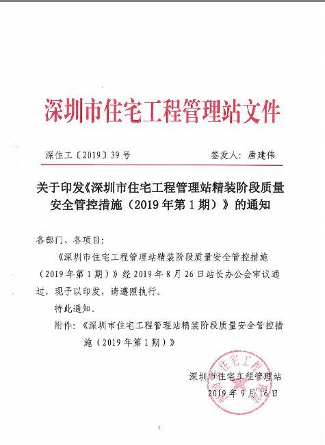 编制《深圳市住宅工程管理站精装阶段质量安全管控措施》,推动精装阶段质量管控措施标准化、规范化。