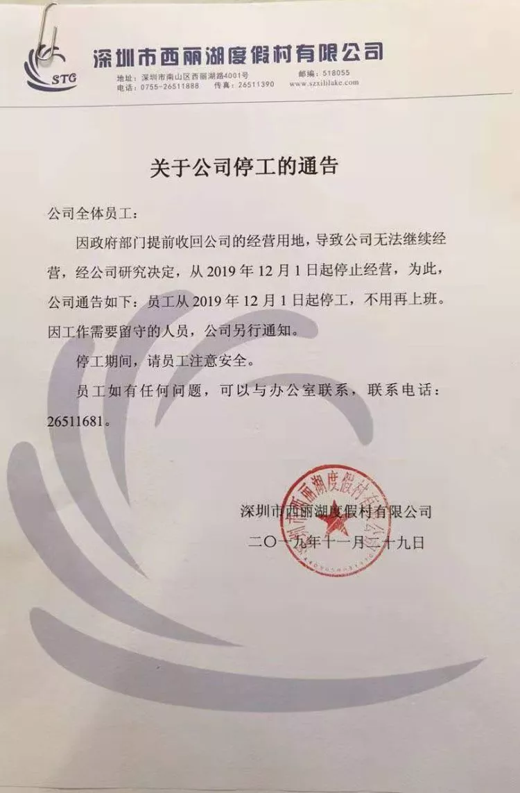 2019年11月29日,西丽湖度假村发布通告称,政府提前收回经营用地,从2019年12月1日停止营业,已经不接待外来游客,员工同时停工——这意味着市民所熟知的西丽湖度假村即将走下舞台。
