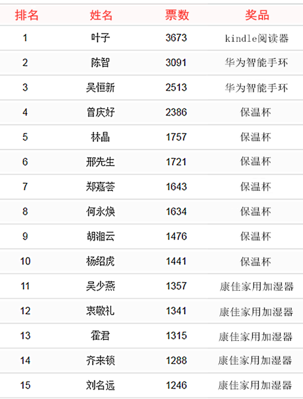 根据评选规则,最终确定“凤栖良木,才择宝安”“宝汇人才,安迎未来”等10条宣传标语被评为“宝安人才十佳宣传标语”。入选作品按排名先后可获得kindle阅读器、华为智能手环、精美保温杯、康佳家用加湿器等奖品。评选结果在“宝安人才”微信公众号、深圳新闻网、深圳宝安网同步公示。