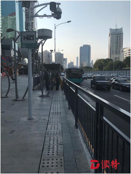 而另一处地点,从大剧院地铁站 F出口处往罗湖书城方向,行人须绕行街边花园步道和街边商家通道,对于骑自行车和电动车的人尤其不便。而地王大厦公交站台跟岗厦北地铁站②公交站台一样非常狭窄,站台左右两边的人行道狭窄处仅约两米宽。在该处站台背后,中国铁建股份有限公司设置了一块站名指示牌,署名单位为地铁5号线施工总承包项目经理部。记者询问了一位路过的市民,市民说经常路过此地,应该是地铁施工所以就占用了之前的人行道,"这里走路还好,骑车就不方便了,因为有台阶"。