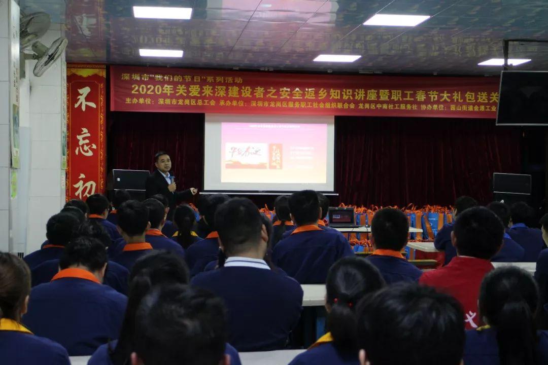 新春佳节将至,为帮助更多的来深建设者平安返乡,安心过年,1月13日晚,一场“有料”又“有爱”的平安返乡知识讲座暨职工春节大礼包送关爱活动在园山街道金源工业园区党群活动中心成功举办,本次活动由龙岗区总工会主办,龙岗区服务职工社会组织联合会、龙岗区中南社工服务社承办。金源工业园区120余名职工代表参与了本次活动。