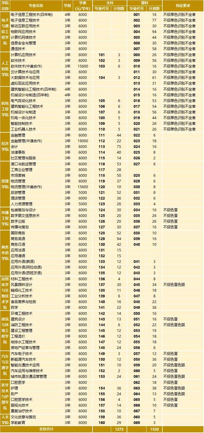 ②以下各招生专业、专业代号、计划数、选报证书、特征要求等及其它备注以广东省招生办公布的专业目录为准;
