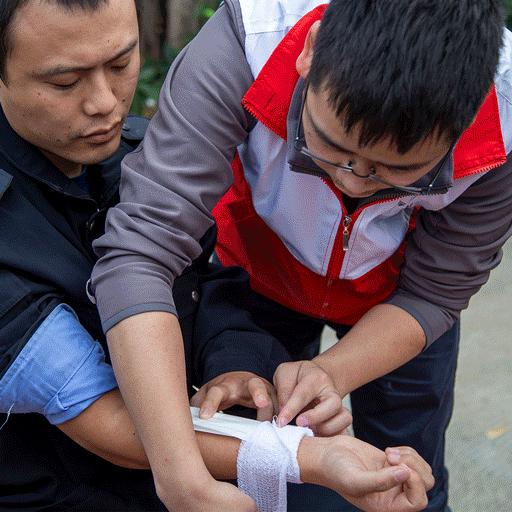 参训学员分为5人1组,每组配备2名导师,参训学员对医疗救护学习的热情浓厚,全副身心投入心肺复苏、异物卡喉、外伤的止血包扎等基本技能现场模拟操作。