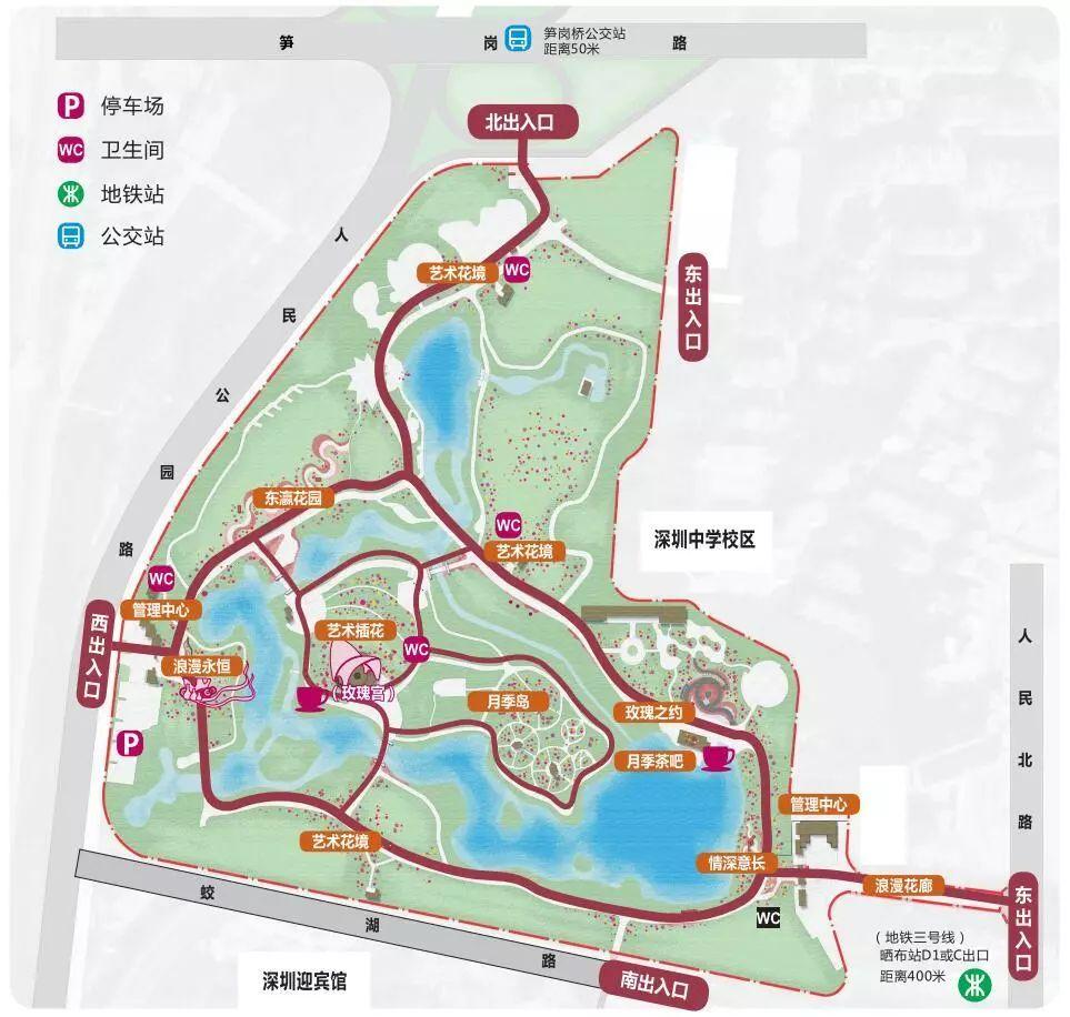 交通指引:①可乘坐地铁3号线至晒布站下车,再步行前往公园;②乘坐公交至深圳中学站、笋岗桥站、东门中站下车,再步行前往公园。