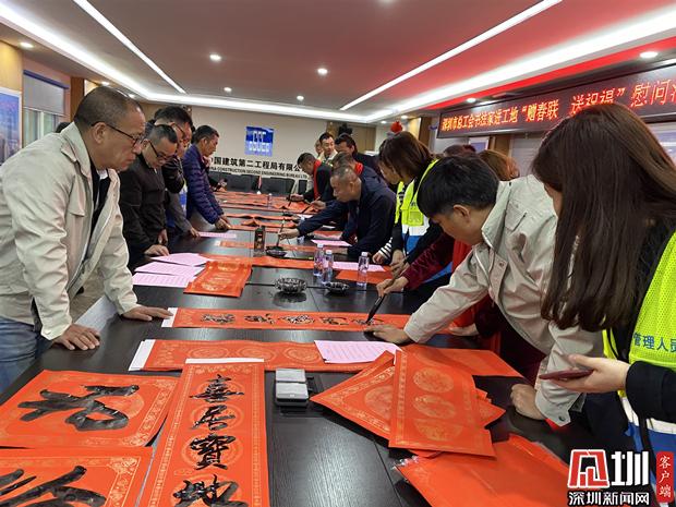 “春节马上来临,这次活动主要想向仍然坚守在岗位的工友们表达一下慰问和感谢,公司每年都会组织赠春联送祝福活动,深受广大工友们的喜爱。”中建二局华南分公司星河雅宝项目常务副经理邰冶告诉记者,与以往不同的是,今年深圳市总工会特地邀请本土书法家现场为工友们书写其喜爱的春联,送以春节的祝福,让他们在项目上也感受到了浓浓的节日氛围。
