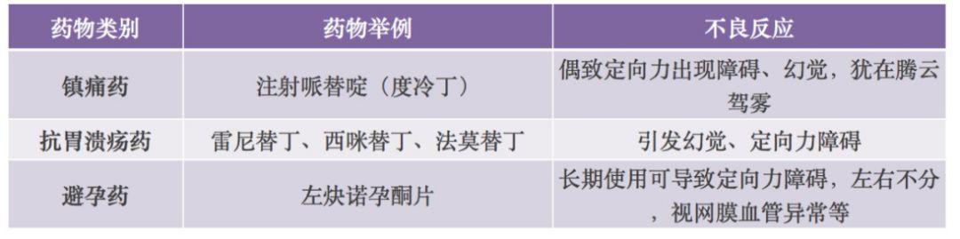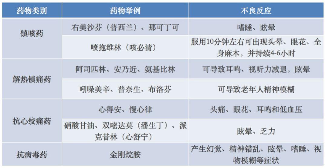 驾驶车辆过程中最重要的就是精神集中,如果服药后出现眩晕或幻觉,势必会影响驾车安全。具有此不良反应的药物主要包括以下几类: