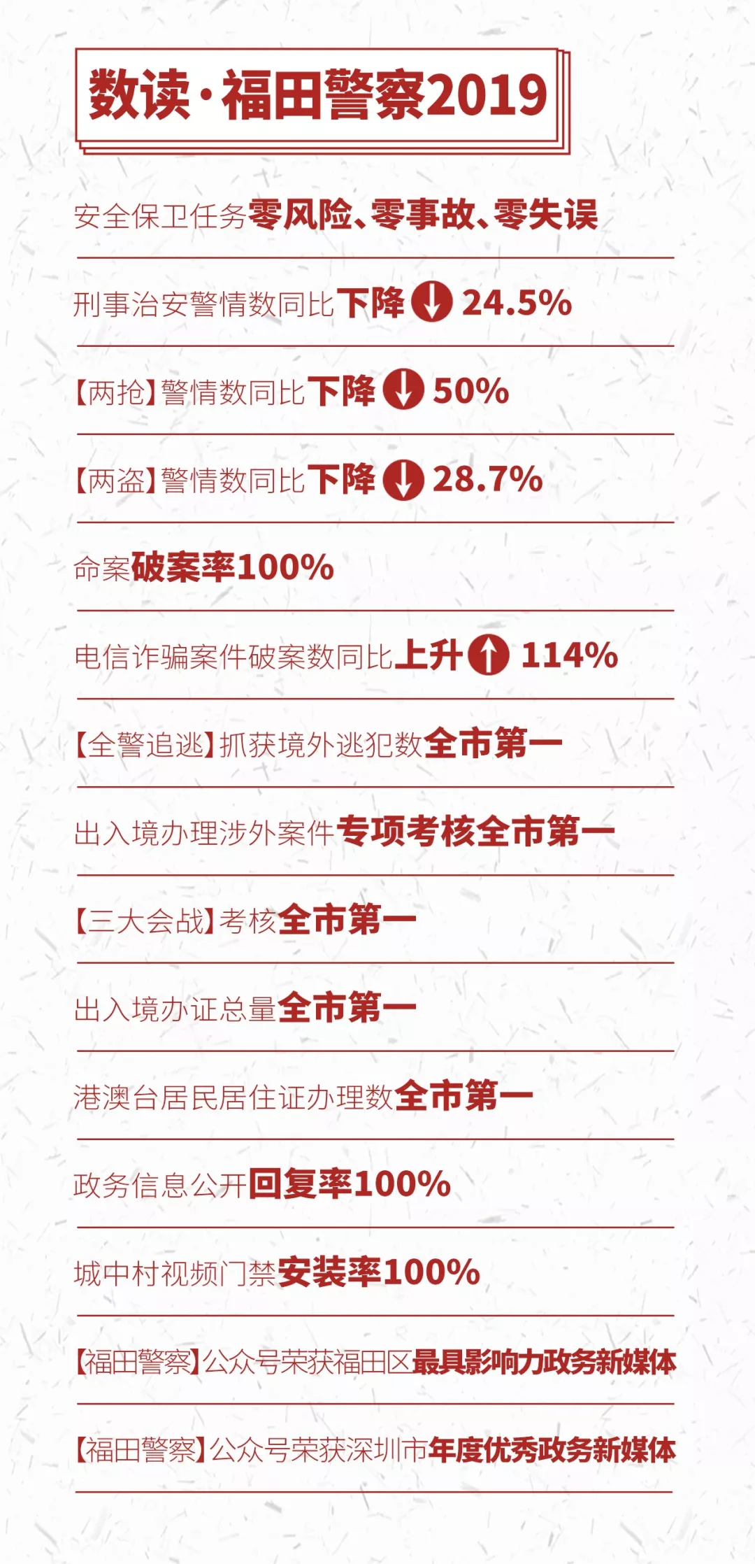 刚刚过去的2019年,是福田公安勇担使命,砥砺奋进的一年,在市局党委和区委区政府的坚强领导下,福田公安稳中求进、攻坚克难,稳妥应对化解系列重大风险,有效护航中心城区社会政治稳定,打赢新中国成立70周年大庆安保和澳门回归20周年庆典安保攻坚战,各项重大安保活动“零风险、零事故、零失误”;强力推进扫黑除恶、“飓风2019”等一系列专项行动,合成打击效能突显;持续推动现代化警务机制变革,改革攻坚蹄疾步稳;提升社会治安基础治理工作,治安面貌持续向好;队伍建设举措刚柔相济,锤炼“四个铁一般”的过硬警队。