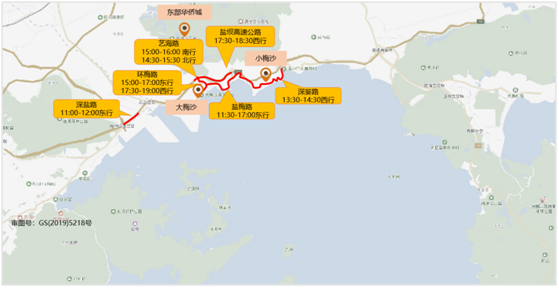 春节期间东部华侨城-大小梅沙片区周边道路拥堵分布(预测)