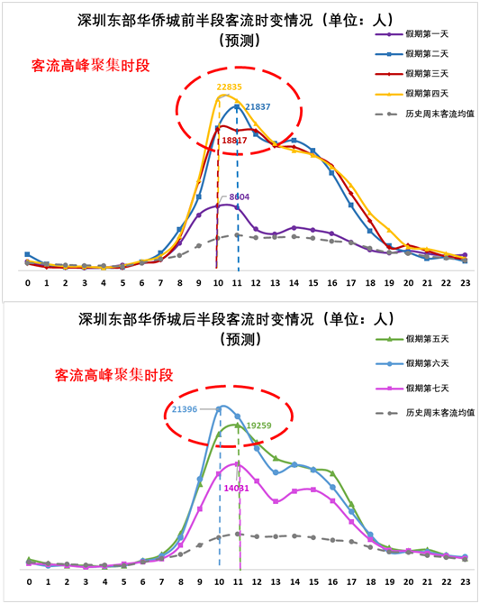 预计东部华侨城1月24日至1月30日(农历年三十至正月初六)期间,每日的客流高峰将发生在10:00-12:00。其中,1月24日(农历年三十)小时客流量约为历史周末客流量的1.9倍,1月25日至1月29日(正月初一至正月初五),小时客流量约为历史周末客流量的4.5倍,1月30日(正月初六)小时客流量约为历史周末客流量的2.9倍。每日小时客流量分布如下: