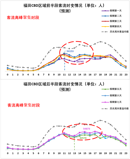 预计福田CBD区域假期间每日11:00-20:00客流量变化幅度不大,假期客流量整体低于历史周末客流量。每日小时客流量分布如下:
