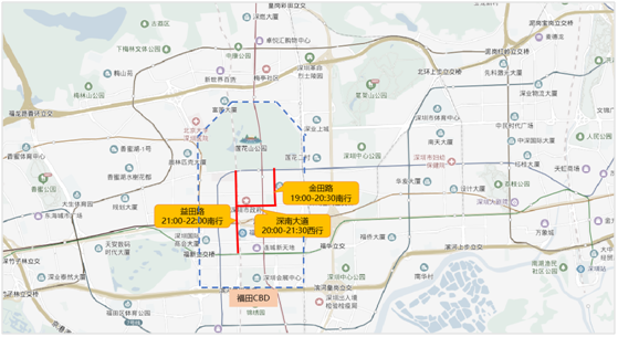 预计福田CBD区域春节假期周边主要拥堵路段有金田路(19:00-20:30南行)、深南大道(20:00-21:30西行)、益田路(21:00-22:00南行)。具体分布如下: