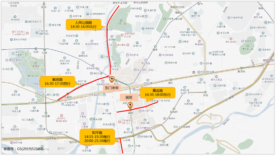 预计国贸-东门老街片区春节假期周边主要拥堵路段有解放路(16:30-17:30西行)、人民公园路(14:30-16:00北行)、嘉宾路(16:30-18:00东行)、和平路(14:30-15:30南行、20:00-21:30南行)。具体分布如下: