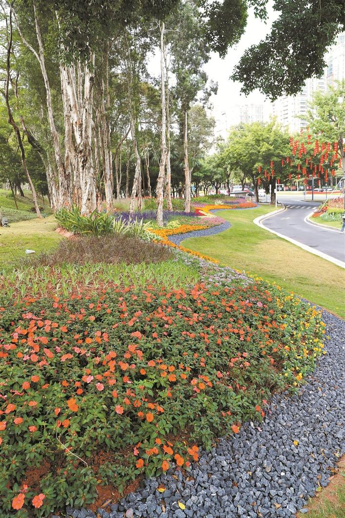 五洲宾馆周边五色斑斓的花带。