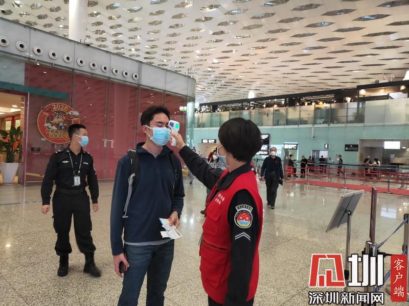 在深圳机场,工作人员对往来乘客进行体温检测。