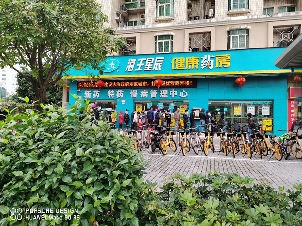 景田海王星辰药店门口,深圳市民戴口罩排队购买口罩等防控物品。(蒋溪林 摄)