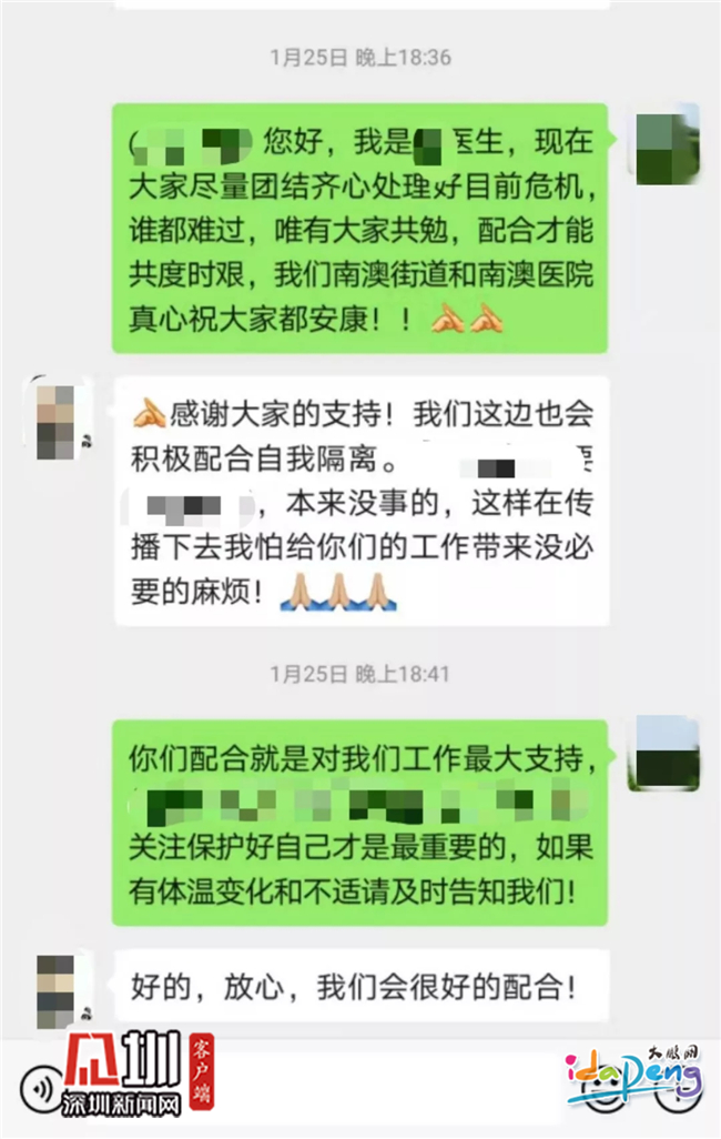 他们就是南澳人民医院的医疗工作人员。在这次疫情中,市二医院、新区医疗健康集团联动,指导南澳人民医院流动社康医务人员积极落实大鹏新区关于社区“1+3”工作小组的工作部署,针对这11位武汉同胞的情况,工作人员马上与他们建立了微信群,在线对他们核实了身份。