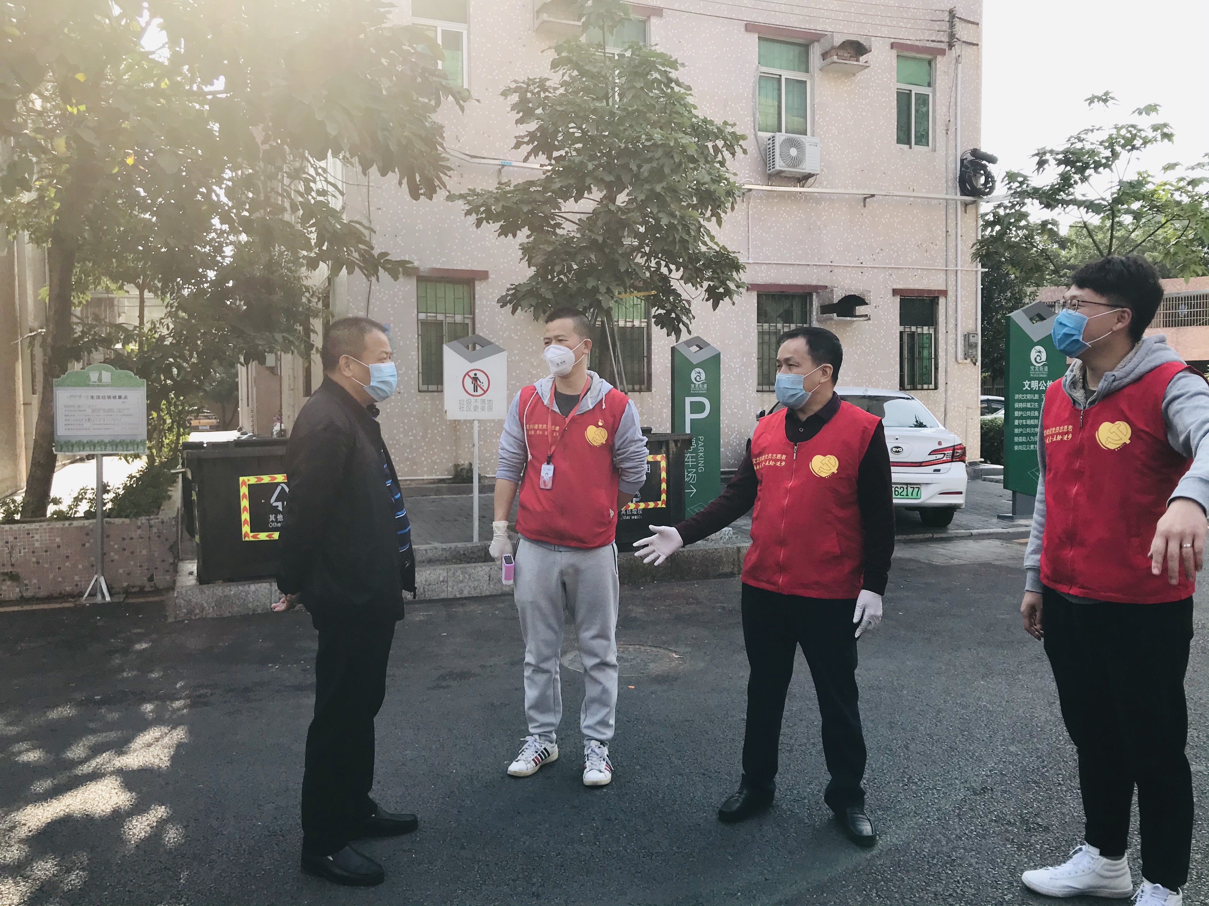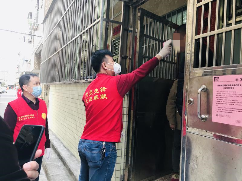 社区党委书记黄雄光同志及班子成员、工作人员为居家隔离人员测量体温。