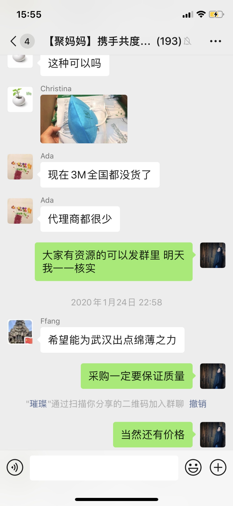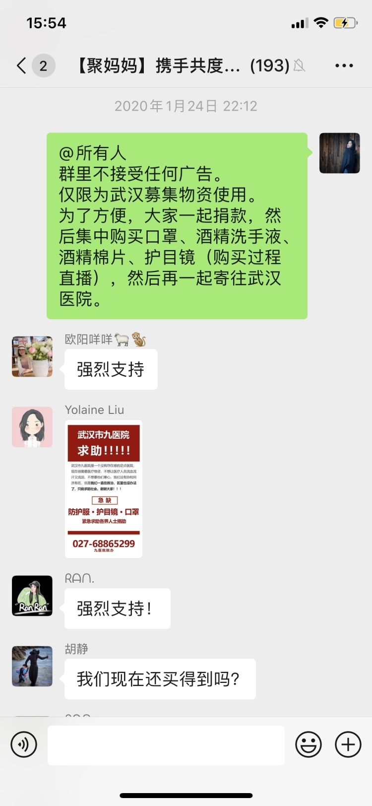 这一百多名妈妈是一个名为“聚妈妈携手共渡难关”(以下简称“聚妈妈”)微信群的成员,Miya是“聚妈妈”的发起人之一。1月24日除夕那天,Miya与一位朋友聊起疫情,两人都觉得,医院缺物资,一两人的力量又太单薄,不如发动朋友们一起购买直接送到医院。Miya在当晚9点左右建了这个临时群,并邀请周围熟识的朋友加入。