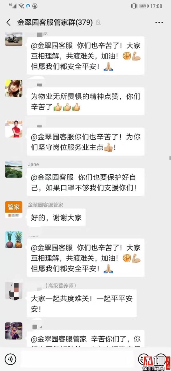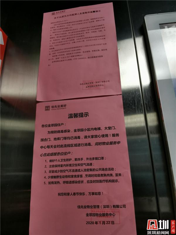 小区物业管理处主任邹菊彬表示,目前小区每天进行3次全面消杀,包括地面、电梯、楼道等多个位置。他表示,小区内已张贴《新型冠状病毒感染的肺炎相关知识和个人防护》等防护指引和宣传资料。物业工作人员向还未返深的住户进行了宣传解释,消除恐慌。对返深的小区住户已做好详细信息登记,对居家医学观察的住户每天两次随访,并经常给他们送一些生活用品。“我们的工作人员已经把电话留给他们,有啥需要帮忙的可以随时联系”,他说到。