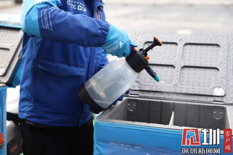 外卖小哥向保温箱内喷洒消毒液进行消毒。
