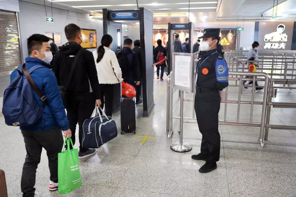 在地铁站入口处,安检人员检查乘客是否佩戴口罩,并对未佩戴口罩人员进行劝返。