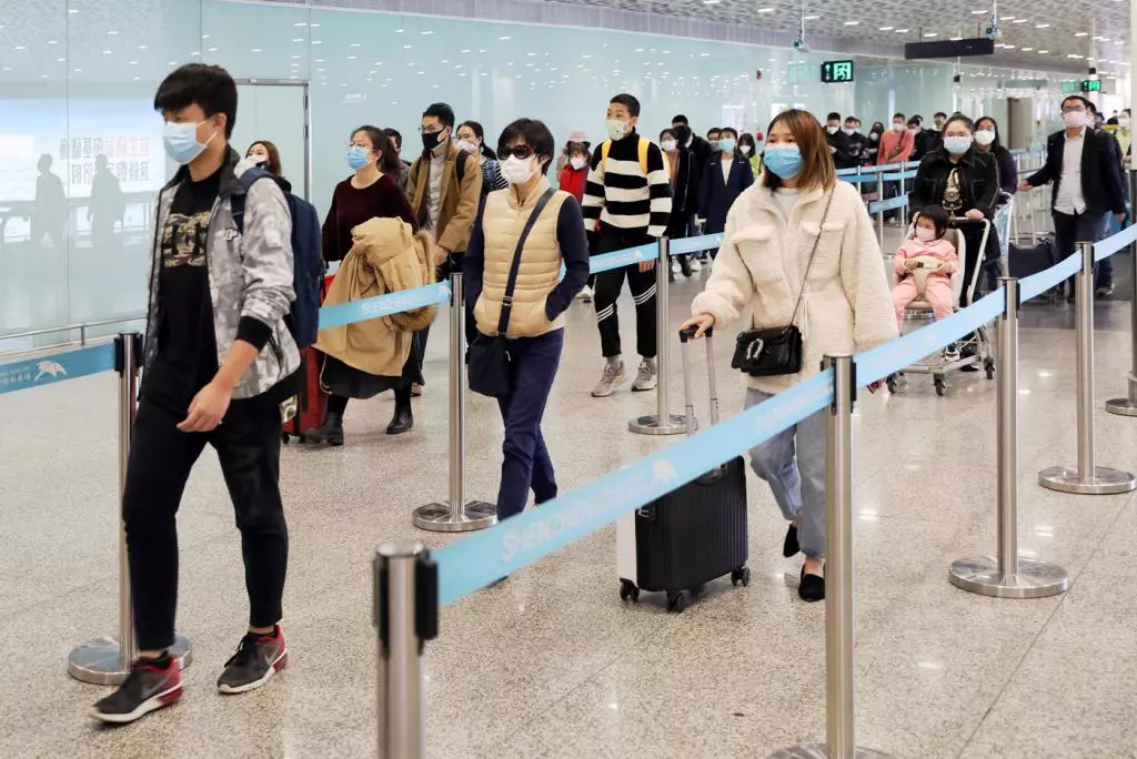 抵深旅客排队前往出站口,旅客只需走过,便可测出其体温是否正常。