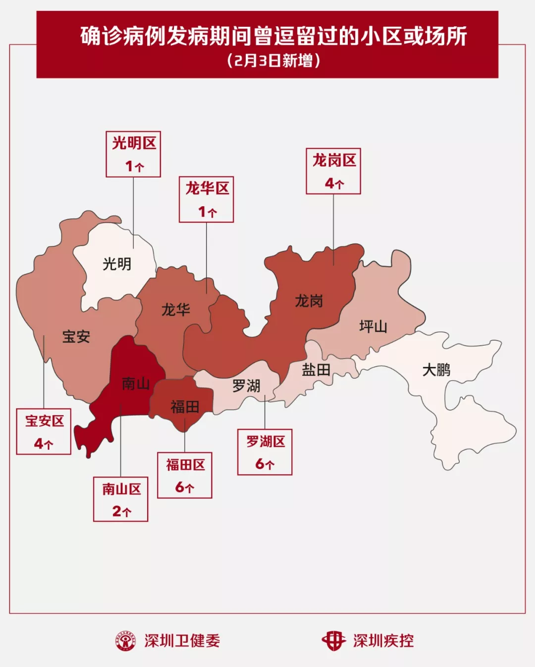 2月3日,疾控专业人员通过最新的流行病学调查确认,深圳新增24个小区(场所),有新确诊的病人在出现病征期间曾经逗留。