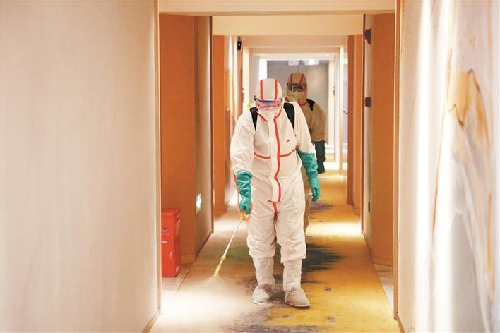 ▲消杀人员对酒店走廊进行消杀。