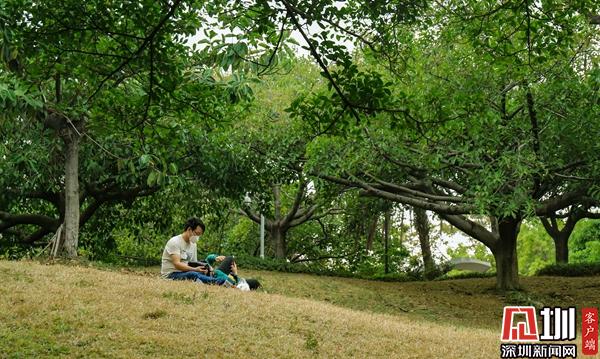 灵芝公园:一对夫妻戴着口罩来公园遛娃。