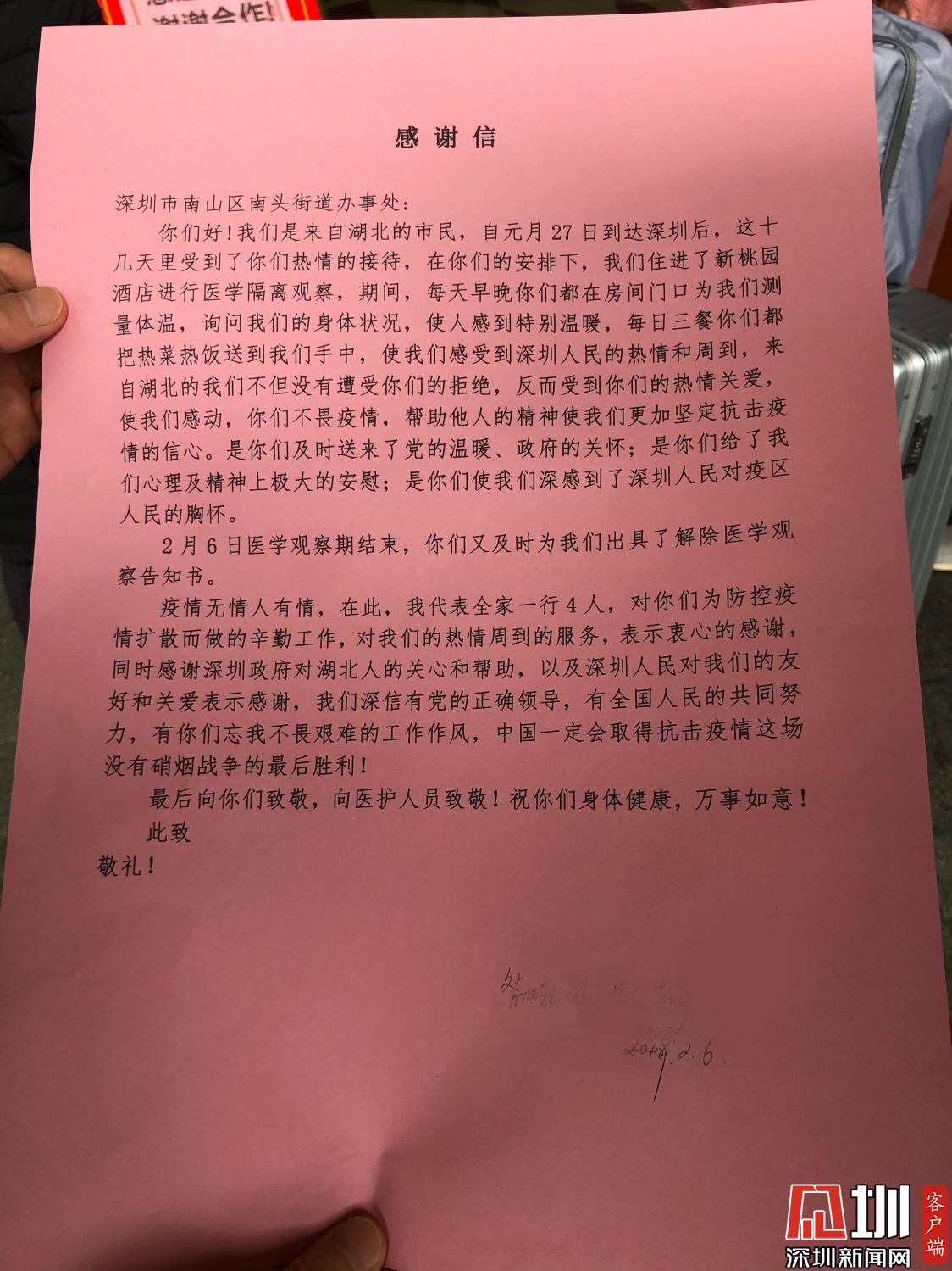 2月6日医学观察期满,经检测他们一家并无不适症状,卫健局驻点人员为其出具了解除医学观察告知书。李女士拉着行李满眼泪花说道:“深圳各级政府部门高效实干,深圳的工作人员很热心很细心,疫情猖獗时,人间自有真情在,真的感谢你们。”
