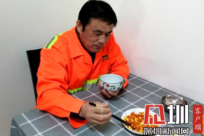 胡萝卜丁炒玉米,再加一碟土豆丝下饭,这就是黄学志的午餐。黄学志说,他有几年没回老家了,本来计划春节回去过年,顺便带老伴看病,没想到疫情越来越严重,于是就打消了这个念头。疫情发生以来,除了日常工作,他还要负责为值班同事普及疫情防控知识的任务。从早上7点半到12点半,下午1点半到5点半,他每天在沙头角7个垃圾转运站、18个公厕来回奔走,给同事配送口罩及消毒用品,检查他们的身体健康情况。“现在是疫情防控关键期,我们也希望为防控工作贡献出来自环卫清洁行业的一份力量。”黄学志说。(见圳客户端、深圳新闻网记者邓雪婷)