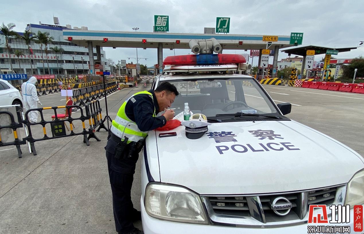 苏廷源在鲘门高速口防疫检查站执勤,对进入深汕合作区的车辆及人员进行逐一排查。排查途中,苏廷源抽空在警车旁迅速解决了自己的午餐。(见圳客户端、深圳新闻网记者罗瑜)