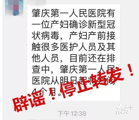 “肇庆第一人民医院有孕妇确诊,产前接触很多医护人员。现在要隔离183人,封闭医院四个月。”近日,肇庆的微信群中,这条谣言疯传,引发市民恐慌,不敢去医院就医。