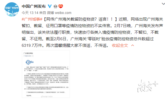 2月7日晚,广州海关发布声明称,网络“广州海关暂扣、截留、征用口罩等疫情防控物资”为不实传言。目前,广州海关依法履行职责,快速放行各类入境疫情防控物资,不暂扣、不截留、不征用。截至2月6日,广州海关“零延时”验放疫情防控物资总件数超过6319.7万件。上海、天津、宁波、大连、郑州等地海关也纷纷辟谣,表示不会征用个人口罩。