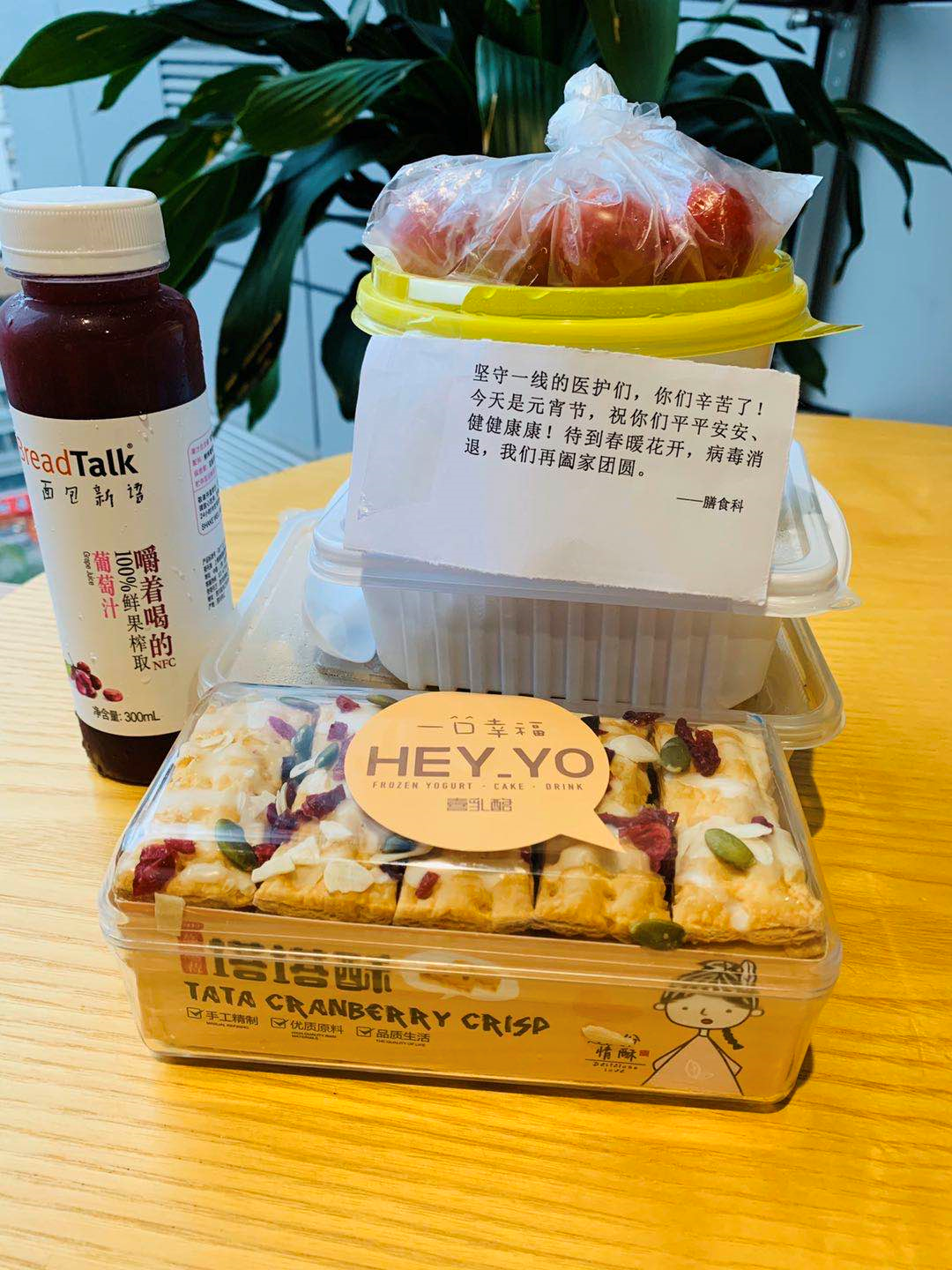 当天中午和晚上,发热门诊、感染科、隔离病房、检验科等一线的医护人员,除了收到可口的饭菜外,还收到了一碗热气腾腾的汤圆。让他们意外的是,汤圆盒上还贴了温馨的字条,“坚守一线的医护们,你们辛苦了!今天是元宵节,祝你们平平安安、健健康康!待到春暖花开,疫情消退,我们再阖家团圆。”
