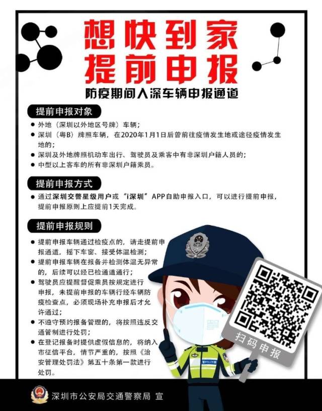 南方网2020年2月8日讯 深圳从2月8日(元宵节)开始,在所有进出深圳市的公路、城市道路实施提前申报措施,车辆在首次通过“车辆防疫检查点”时,必须经网上提前申报,才可以通过。