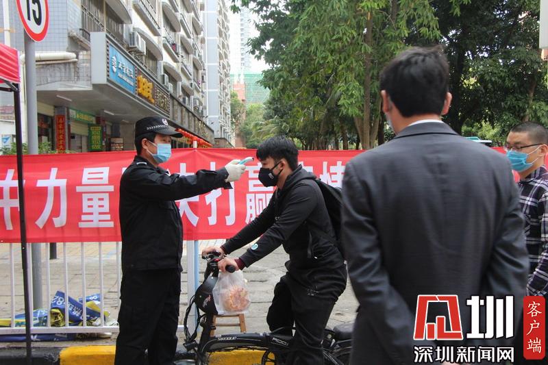 福田梅山苑保安正为一名进入小区的住户测量体温。
