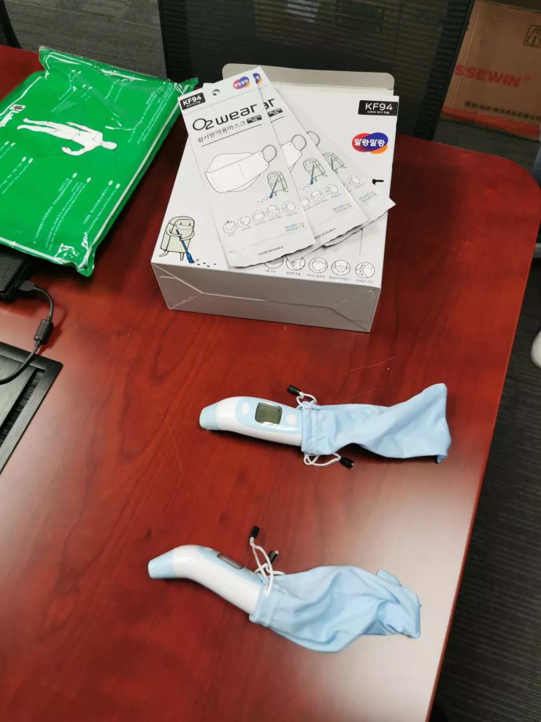 企业的口罩、测温仪等防疫物资。新华社记者孙飞2月7日摄