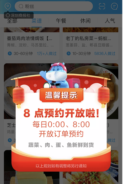 下单时间:每日0点、8点开放订单预约。运力紧张,需提前抢购,此外,盒马部分区域门店暂只可预约当日配送服务,若当日配送服务已约满,会显示“配送小哥已约满,欢迎门店选购”。