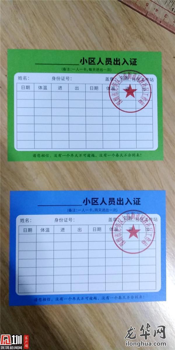 近日,根据不同居民的情况和需求,大浪街道用四种颜色的卡片对居民出入进行分类管理:红色是有发热等异常症状、按要求正在居家隔离的人员,黄色是来深14天内,正在居家隔离且无异常症状的人员,可视情况转为其他管理模式。红、黄两类人员严禁其出门,由社区工作站提供物资采购、帮送服务。蓝色是没有居家隔离、身体状况正常的在家人员,凭证可以两天出入1次;绿色是没有居家隔离、身体状况正常的上班人员,凭证每天可以出入1次。
