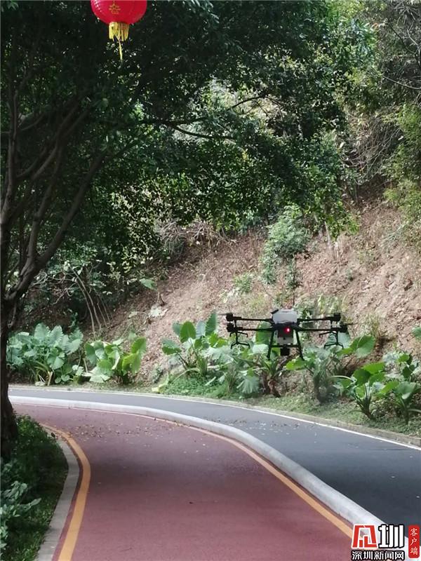 罗湖:多架无人机对淘金山绿道进行全面消毒