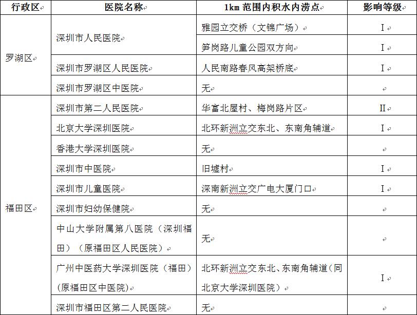 根据2019年度全市积水内涝报送情况,深圳市水务局初步梳理出全市49家发热门诊(含1家新型冠状病毒感染肺炎定点救治医院)周边积水内涝点29处,并结合积水内涝严重情况分为Ⅰ、Ⅱ、Ⅲ级,详见附件1《全市发热门诊及定点救治医院周边积水内涝点初步梳理情况》。