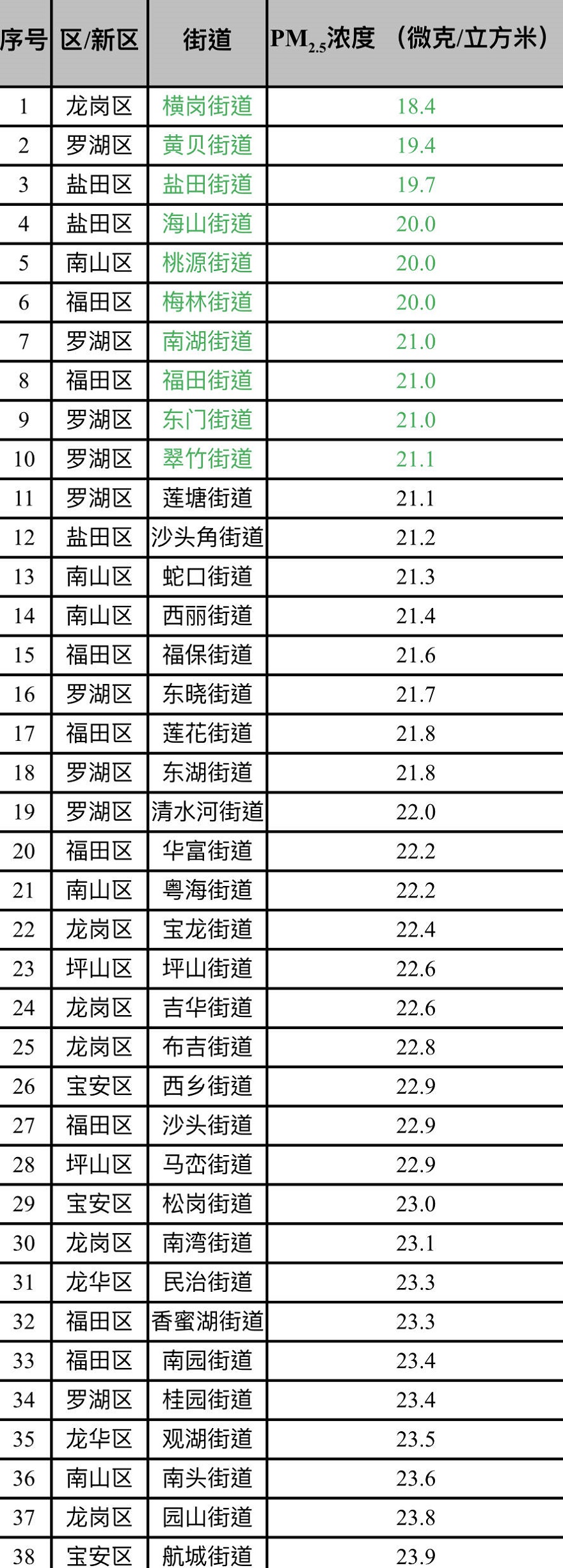 见圳客户端·深圳新闻网2020年2月12日讯(见圳客户端、深圳新闻网记者 陈婕)2020年1月,深圳市74个街道PM2.5浓度在18.4-32.3微克/立方米之间,均值为24.3微克/立方米。排名前十的是:横岗、黄贝、盐田、海山、桃源、梅林、南湖、福田、东门和翠竹等街道,排名倒数前十的是:马田、新安、观澜、福城、笋岗、沙河、福永、华强北、沙井和新湖等街道。