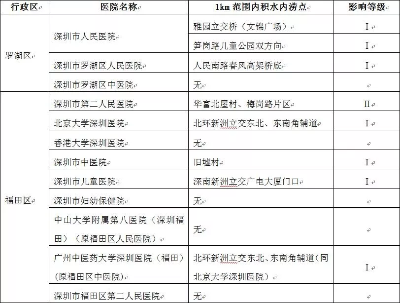 根据2019年度全市积水内涝报送情况,深圳市水务局初步梳理出全市49家发热门诊(含1家新型冠状病毒感染肺炎定点救治医院)周边积水内涝点29处,并结合积水内涝严重情况分为Ⅰ、Ⅱ、Ⅲ级。
