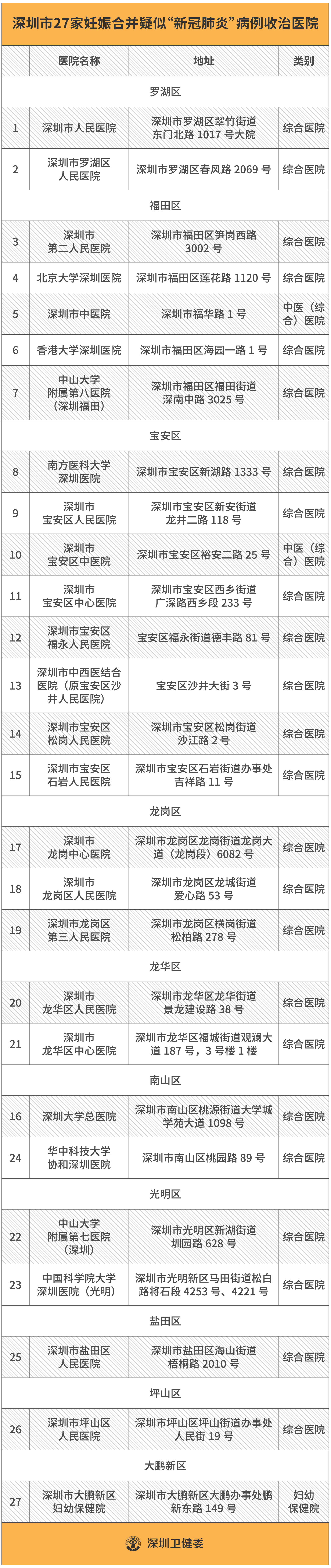 据悉,深圳共有27家妊娠合并新型冠状病毒感染感染疑似病例市、区级收治医院,其中,市级医院8家,区级医院19家,覆盖深圳10个区(新区)。