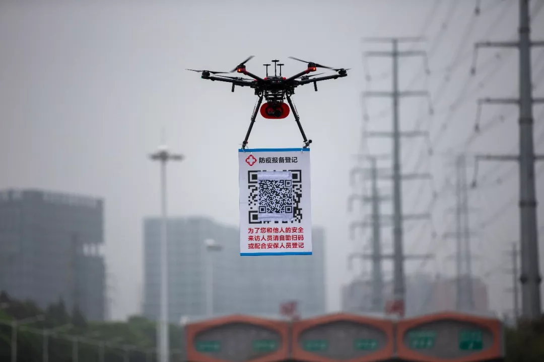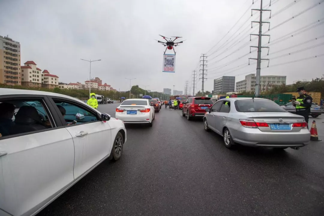 随着返深车辆和人员的增加,深圳从8日开始启用线上车辆申报登记。为提高申报效率,搭载喊话器、悬挂申报二维码的无人机成为防疫一线工作人员的得力助手。民警操作无人机在车辆队伍中穿梭,并通过喊话器提醒驾乘人员扫码登记,减少人员接触的同时提高了效率。