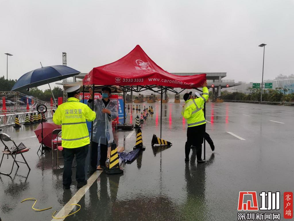 暴雨来临,深圳交警民警在检疫点安装雨棚。