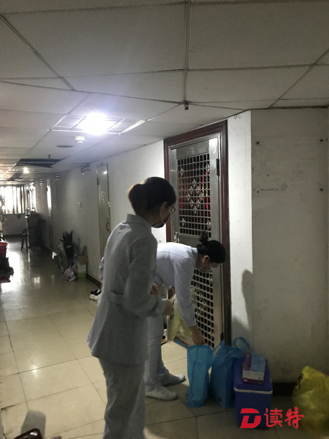 孙女士打开门,将工作人员递进去的防护装备穿戴完毕。“为了保护医护人员的安全,减少交叉感染的可能性,所有的上门检测都会在楼道里进行。”社康中心工作人员说。提前穿好防隔服等防护装备、拿检测时给居民坐的凳子、为凳子消毒,开始进行检测前就需要做很细致的准备工作。