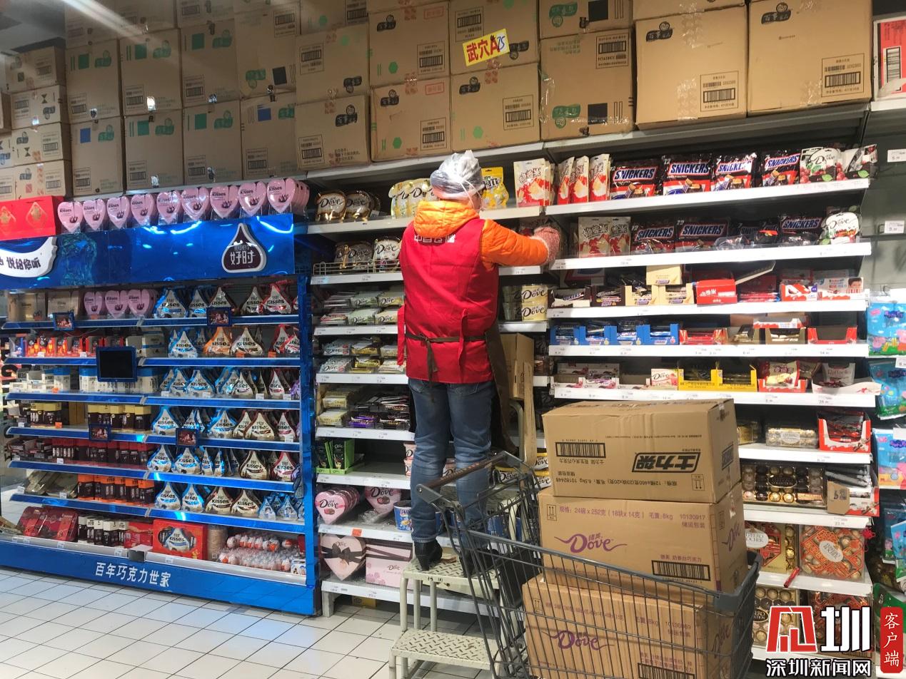 超市里,很多显眼位置都贴有“戴口罩”、“保持一米距离”、“购物篮已消毒”等提示,超市的广播也循环播放各种须知。“现在都买不到手套了。”吕女士和工作人员借了两个一次性购物袋当作手套戴上,然后开始挑选商品。虽然没有挑选到适合码数的尿不湿,吕女士也买了满满的一车。