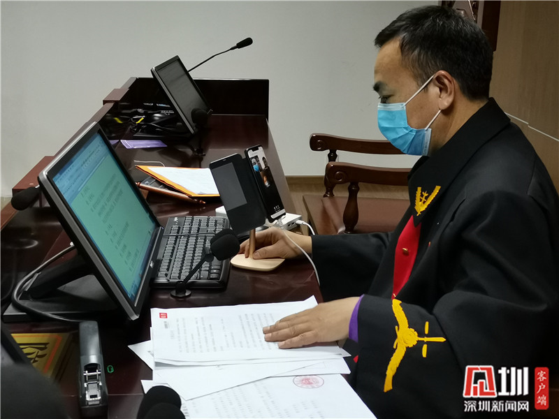 2月13日晚上8点,龙岗法院横岗法庭第二审判庭庭长张国辉在运用掌上法庭审理一宗农民工追讨欠薪的劳务纠纷案件。